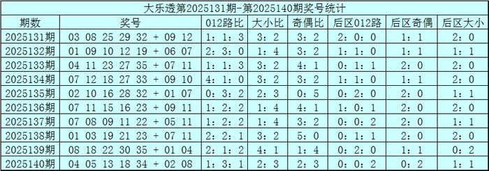体彩大乐透第25140期奖号为:04 05 13 18 34+02 08,前区奖号012路比为1:3:1,奇偶比为2:3,大小比为2:3,后区为全2路号码。