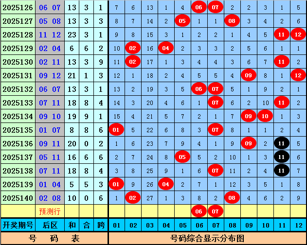 后分别析:在第141期历史同时开奖中,和值大小为5:11,跨度奇偶比为10:6,本期后区扎眼两码06和07。