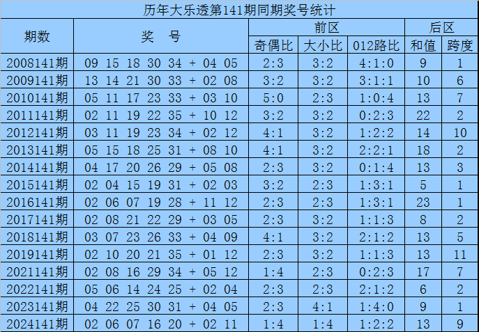 第2025140期大乐透奖号为04 05 13 18 34 + 02 08,其中前区号码奇偶比为2:3,大小比为2:3,012路比为1:3:1,后区号码和值为10,跨度为6。